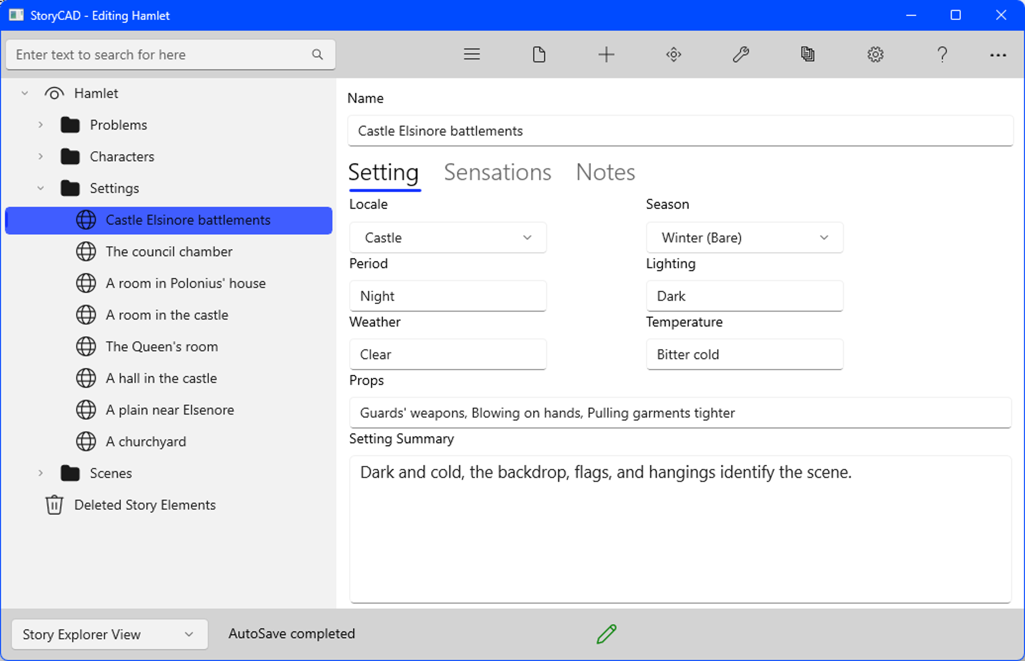 If a setting is used in multiple scenes, but the significance of the setting changes, with a different atmosphere or props, you may want to create a separate outline entry for the new setting.