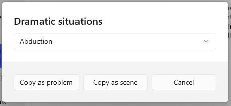 This tool works with the Scene tab on the Plot form to help define the conflict for a scene. If you select Copy from the Dramatic Situations form, the elements of the situation you have selected will be copied into the elements on the Scene tab of the Plot form for the currently selected plot point.