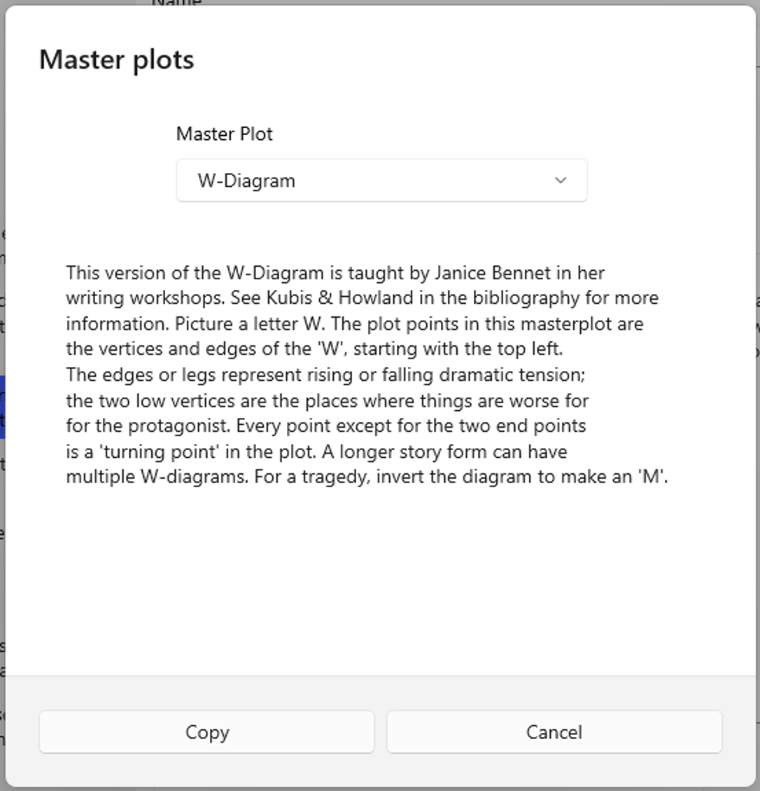 The first few master plots (Three Act Play, W-Diagram, and Hero’s Journey) are story outlines. Selecting Copy when one of these master plots is selected will copy a skeleton plot into your plot outline, which can then be edited from the Plot form. The remaining master plots concern story forms or patterns. Selecting Copy when one of these master plots is selected will add a plot point to your plot outline. This plot point contains notes and suggestions for stock scenes which are relevant to this story form. You can copy more than one master plot into an outline.