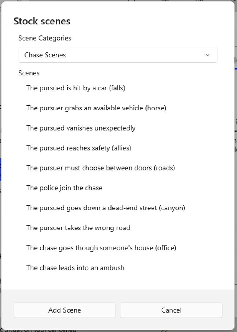 This tool, invoked from the Plotting Aids sub-menu of the Tools menu, provides a list of several categories of stock scenes. These are scenic situations which recur frequently in fiction.