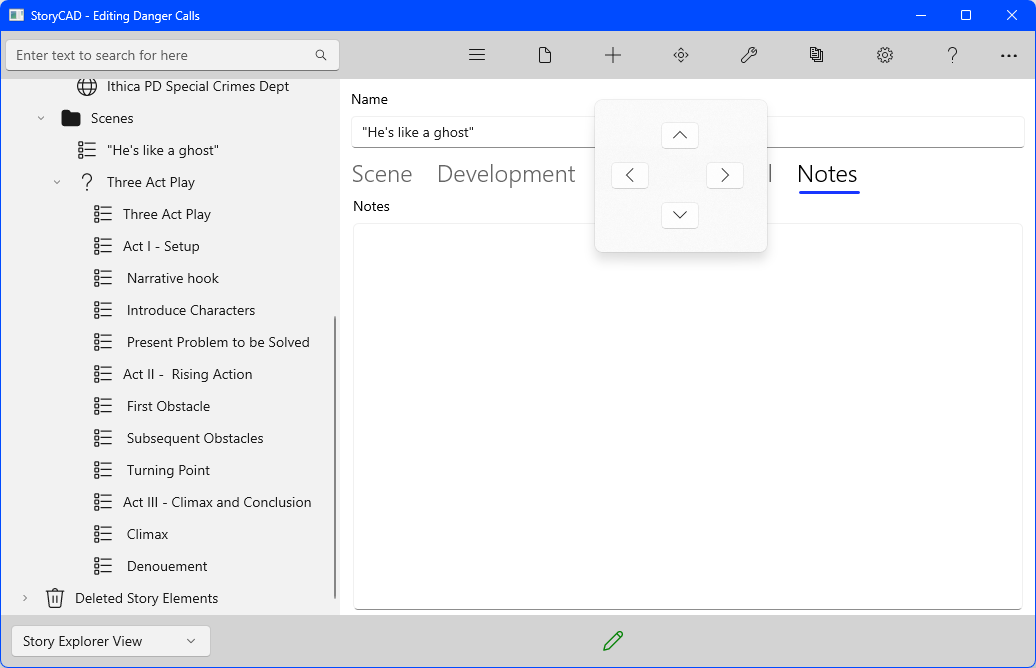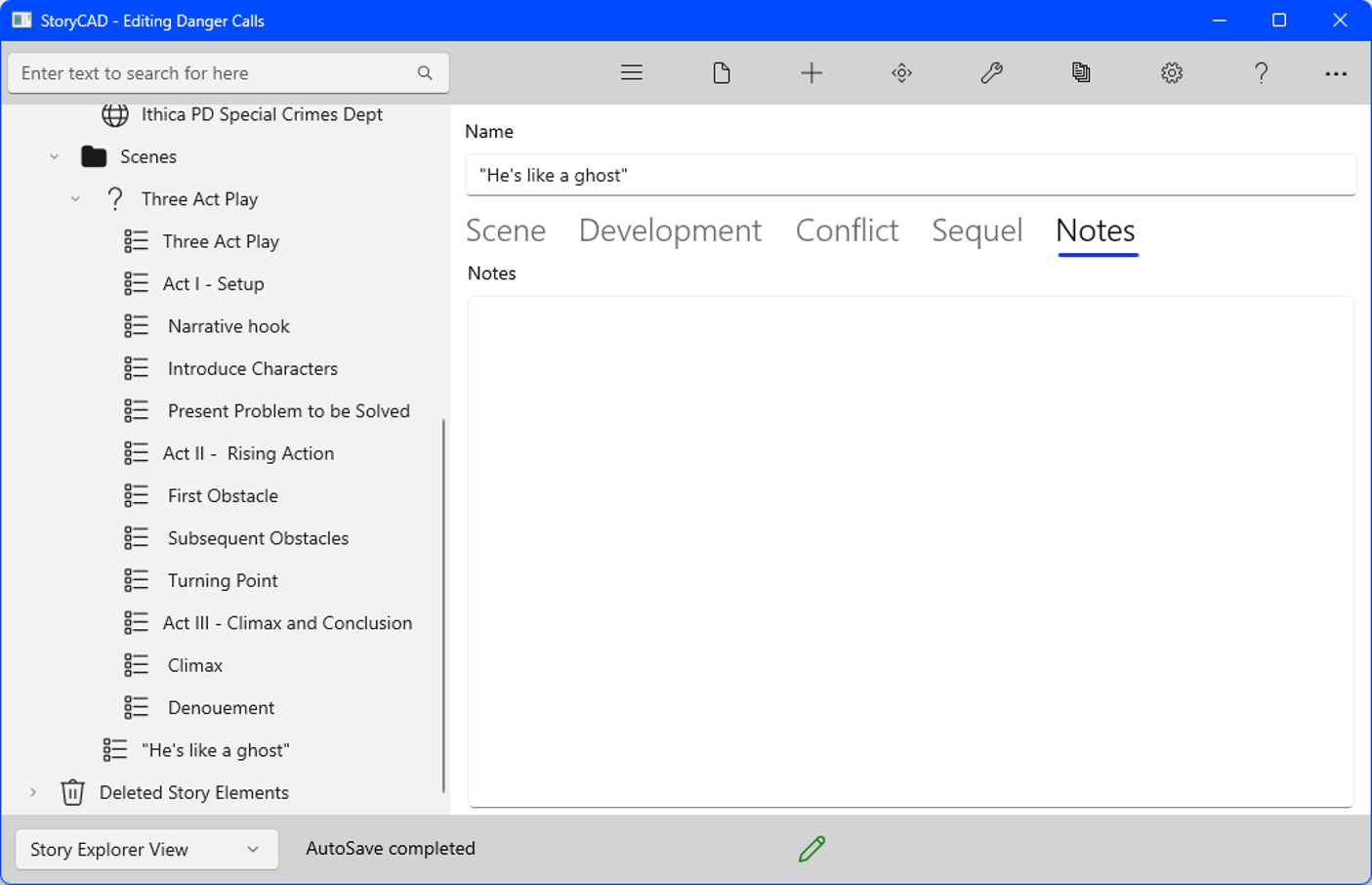 The Three Act Play structure we added under the Scenes folder contains a ‘Climax’ plot point, with Notes that read: