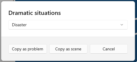 The Dramatic Situations tool, based on Polti’s and Figgis’ books (both titled The Thirty-Six Dramatic Situations), lists a set of situations with roles in opposition and uncertain outcomes- which is to say, situations with built-in drama and conflict: