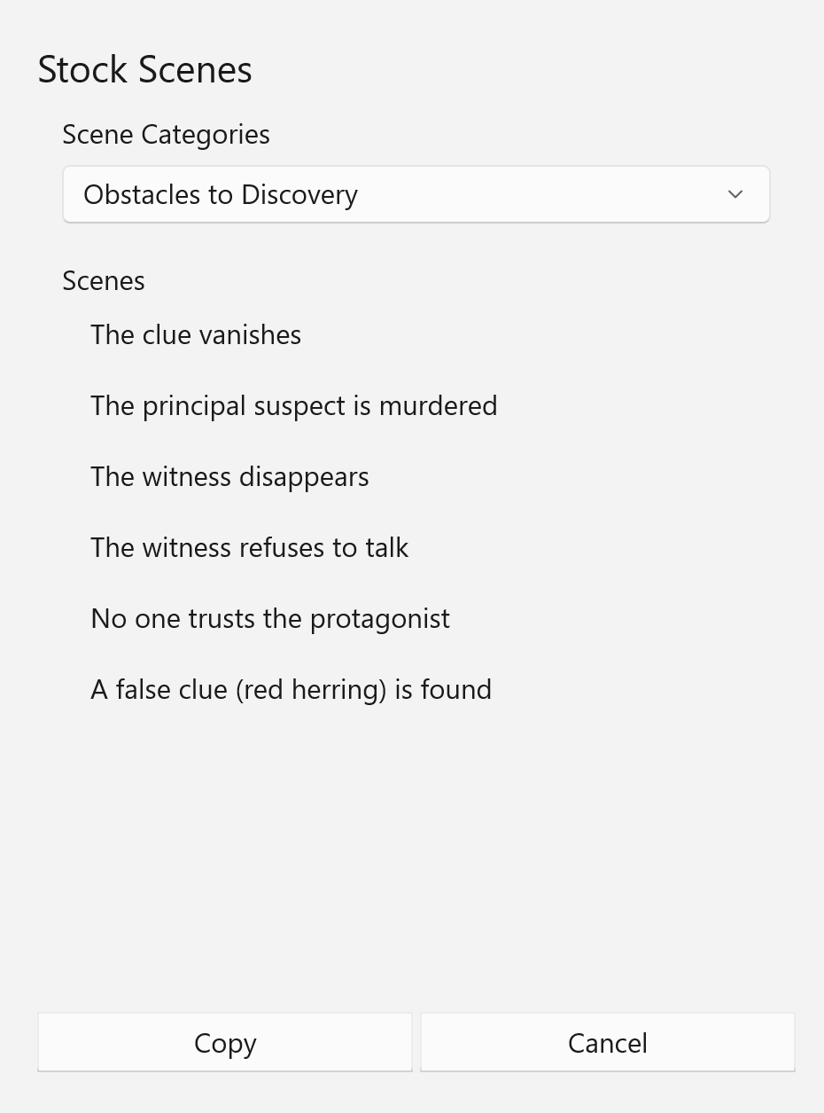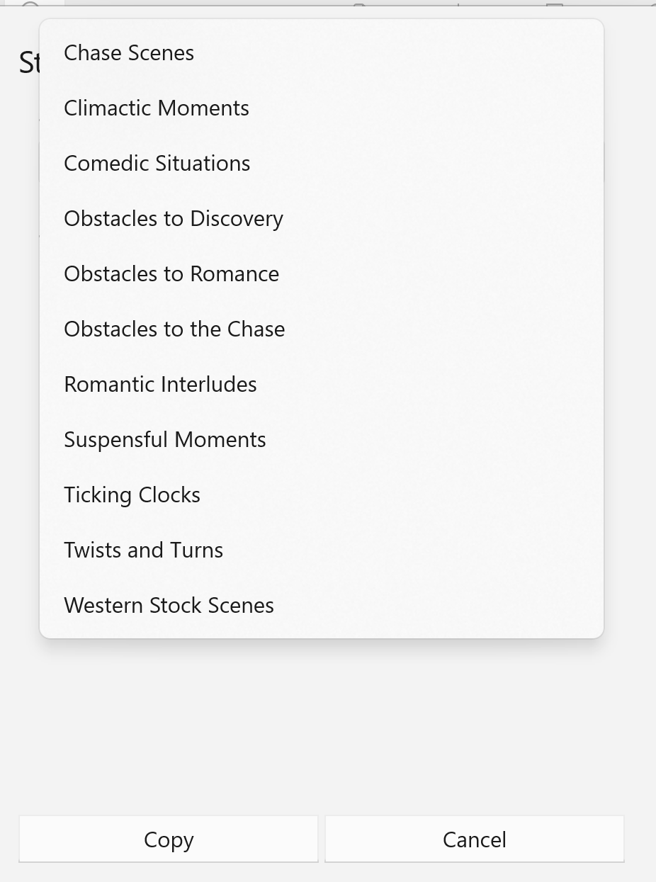 Unlike Dramatic Situations, this tool works just with Scenes. One use is to help develop Master Plot plot points / story beats. For example, the Climatic Moments category can suggest Resolution examples, Ticking Clocks can suggest scenes that ratchet up drama, Obstacles to the Chase (or Discovery, or Romance) can be a Pinch Point, and so forth. As with all examples, if you use it, own it, make it yours. Be specific.